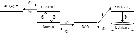 4 ~ 6. DAO는 XML을 통해 Database로부터 Service가 요청한 데이터를 가져옴